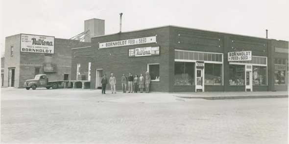 Our grandfather and founder Vern Bornholdt moved from Inman, Ks in 1943, where he farmed with his father and brothers, to Hutchinson where he started Bornholdt Feed & Seed. These pictures are of the first location at 4th and Walnut. Vernon and his wife Edna can be seen in the middle of second picture.
